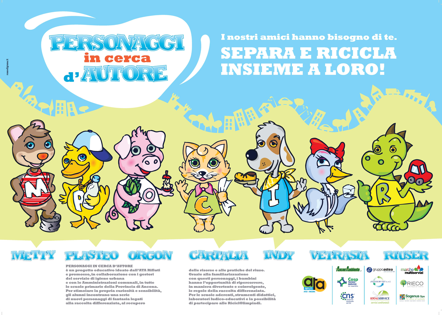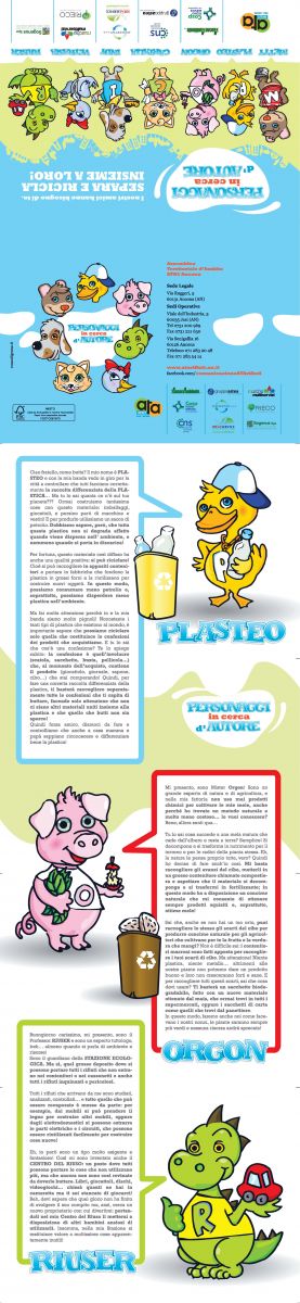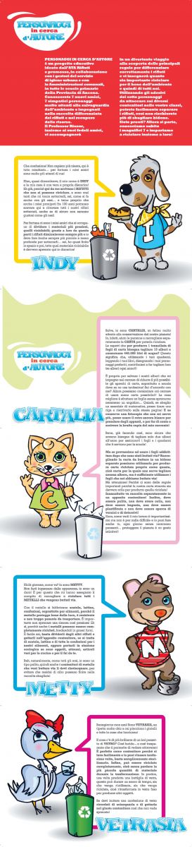 Consigliato per le classi 3°. Gli alunni conosceranno da vicino i 7 personaggi di fantasia legati alla raccolta differenziata, al recupero delle risorse e alle pratiche del riuso. Grazie alla familiarizzazione con questi personaggi, dotati ciascuno di riconoscibilità grafica e personalità ben definita, gli alunni potranno ripercorrere, in maniera divertente e coinvolgente, le regole della raccolta differenziata.